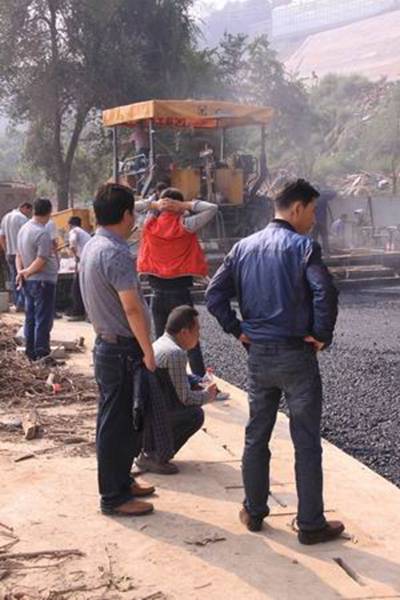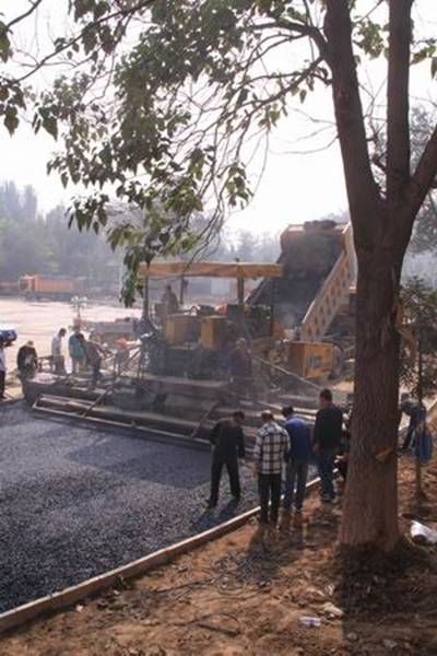 圖1—2為攤鋪機械正在跑道上進(jìn)行鋪設(shè)作業(yè)的場景