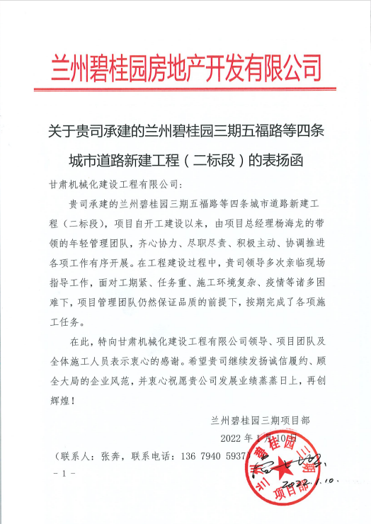 1月10日,我公司收到來自蘭州碧桂園房地產(chǎn)開發(fā)有限公司的表揚函,函中提到,蘭州碧桂園三期五福路等四條城市道路新建工程(二標段)項目自開工建設(shè)以來,項目人員面對工期緊、任務(wù)重、施工環(huán)境復(fù)雜、疫情等諸多困難,在保證品質(zhì)的前提下,按期完成了各項施工任務(wù),提出表揚。