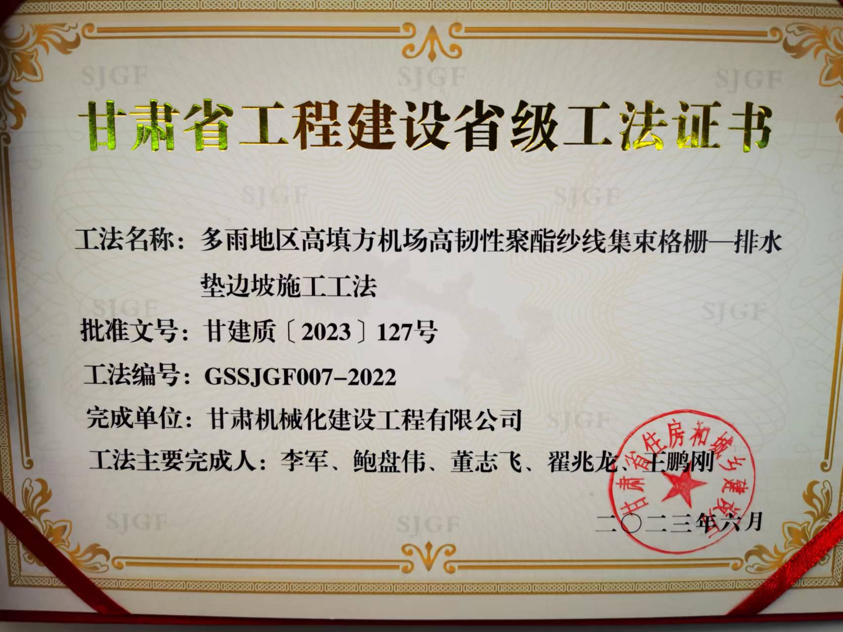 近年來,我司不斷加強技術創(chuàng)新和精品工程創(chuàng)建,科技創(chuàng)新能力和工藝水平再上新臺階。在承建的麗水機場土石方工程02標段中,面對多雨地區(qū)高填方施工中的重難點,公司專門組建了科研和施工小組,通過大量現(xiàn)場工藝實踐、工藝改善,提煉出項目重難點的關鍵技術。2023年6月,獲得了“多雨地區(qū)高填方機場高韌性聚酯紗線集束格柵—排水墊邊坡施工工法”。