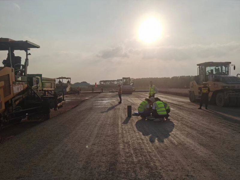 為確保試驗(yàn)段攤鋪設(shè)備工作高質(zhì)、高效進(jìn)行,項(xiàng)目部統(tǒng)一部署,各部門相互配合,認(rèn)真進(jìn)行施工前各項(xiàng)準(zhǔn)備工作,提前對有關(guān)人員進(jìn)行安全培訓(xùn)和技術(shù)交底。施工現(xiàn)場井然有序,項(xiàng)目負(fù)責(zé)人嚴(yán)格把控運(yùn)輸、攤鋪、碾壓、檢測等各施工環(huán)節(jié),保證施工質(zhì)量與安全,同時對試驗(yàn)段標(biāo)高、壓實(shí)度、平整度和厚度等各項(xiàng)指標(biāo)進(jìn)行實(shí)時檢測并記錄,確保各項(xiàng)指標(biāo)符合技術(shù)規(guī)范要求,并確定水穩(wěn)層松鋪系數(shù)、壓路機(jī)最佳碾壓遍數(shù)及速率,最終達(dá)到預(yù)期試驗(yàn)效果。