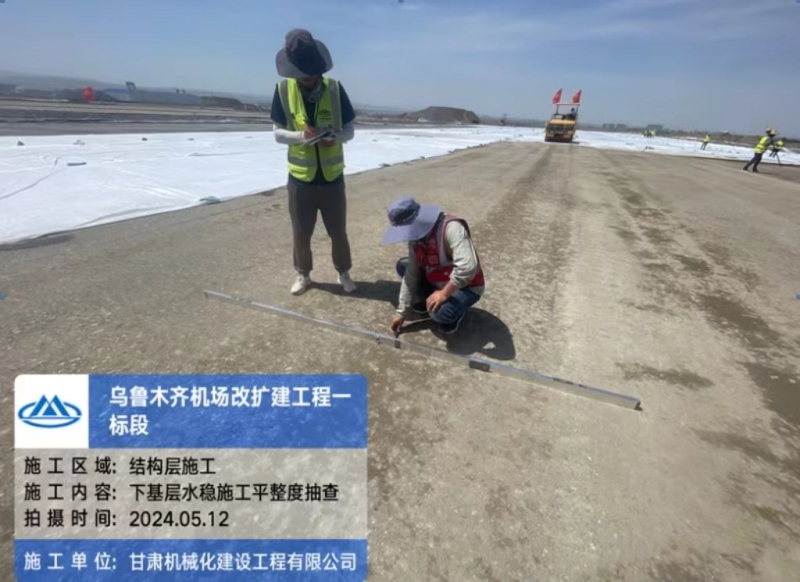 2024年5月11日,伴隨著第一車水泥穩(wěn)定砂礫混合料緩緩倒入攤鋪機(jī)料斗,標(biāo)志著由我司承建的烏魯木齊機(jī)場(chǎng)一標(biāo)段水穩(wěn)基層施工正式拉開序幕。